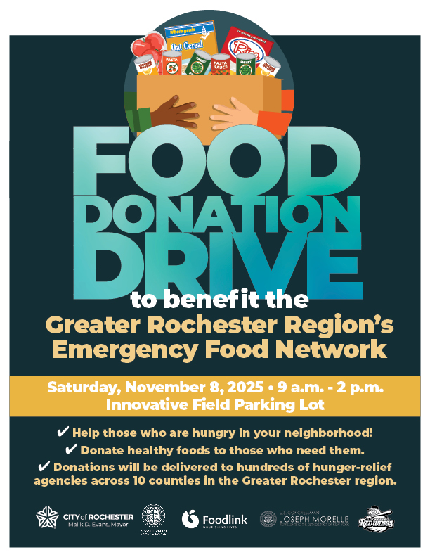 County Executive Adam Bello, Mayor Malik Evans, Congressman Joe Morelle and the Rochester Red Wings have teamed up to sponsor a food donation drive on Saturday, November 8 from 9:00 a.m.-2:00 p.m. at Innovative Field. Donated items will go directly to Foodlink, which, as the region’s food bank, will distribute the products to food pantries and other non-profit organizations that serve food-insecure individuals, especially those affected by the delay in SNAP benefits.